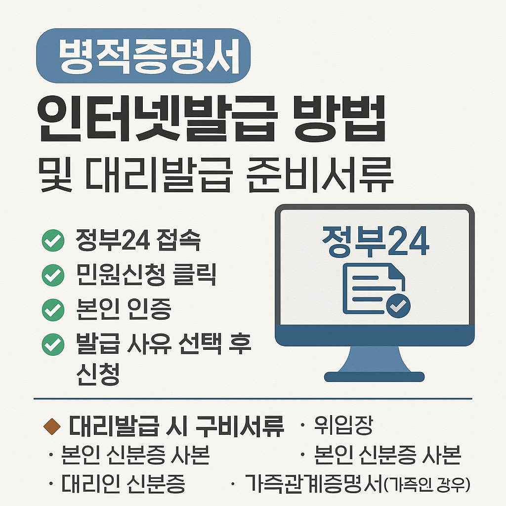 병적증명서는 사회생활에서 필요한 중요한 공식 문서입니다. 정부24를 통해 간편하게 인터넷으로 발급받고, 상황에 맞게 대리발급 시 서류도 정확히 준비해 보세요.